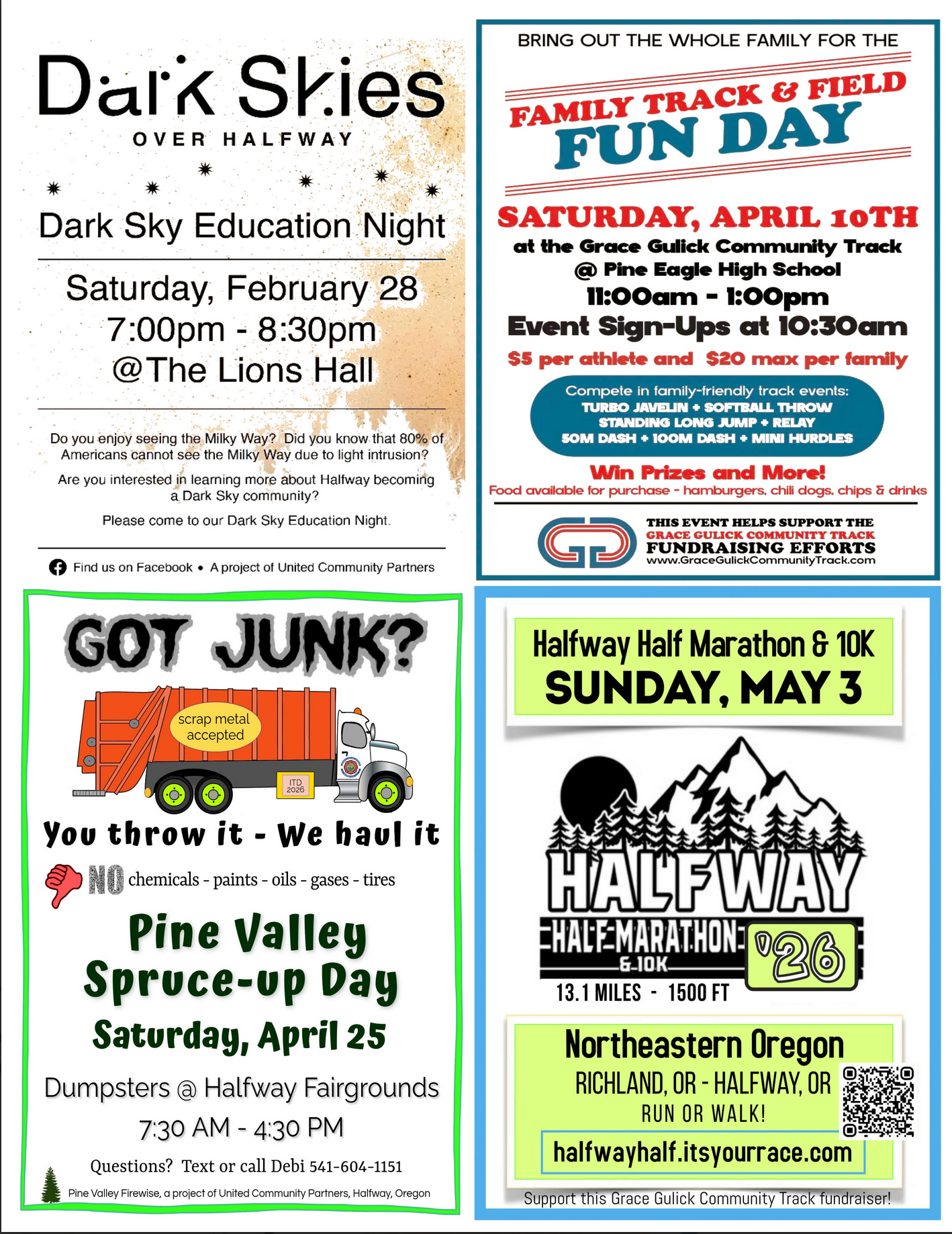 “Thank you to all the volunteers: Halfway Main Street Committee, Hells Canyon Chambers, Pine Valley 2050, United Community Partners Inc., Panhandle Snowmobile Club for our “Tree”, Marvin and Pam Brisk bringing in Santa, Cornucopia Arts Council for Santa’s Stage, Pine Valley Fairgrounds Christmas treats, Lions Club for hot drinks!
